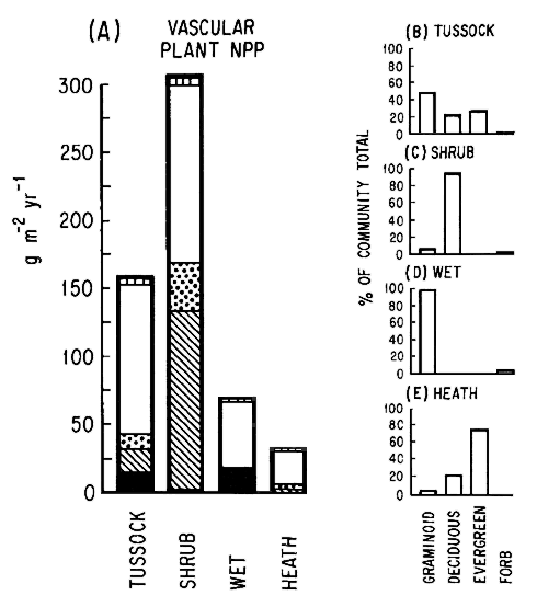 Figure 1. Net primary production (NPP) by vascular plants in four contrasting vegetation types at Toolik Lake (including belowground stem and rhizome growth but not including root production). In (A), total NPP is indicated by the height of the bar. Within each bar, inflorescence production is indicated by the segments with vertical lines, leaf production by the unfilled segments, apical stem growth (current-year's twigs) by the dotted segments, secondary stem growth by diagonal hatching, and rhizome growth by the filled segments. In (B) through (E), the percentage of the community total NPP that is accounted for by each of the four major vascular growth forms is indicated (Shaver and Chapin 1991).