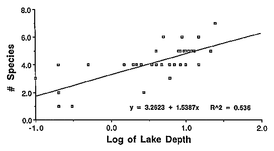 Figure 6. The number of species of pelagic crustacean zooplankton found in lakes and ponds near Toolik Lake, Alaska from 1975 to 1992. This data from 38 ponds and lakes are plotted against the maximum depth (meters) of each water body.