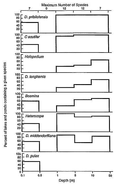 Figure 7. The percentage of ponds and lakes containing a given species of crustacean zooplankton. The ponds and lakes are divided into five categories of maximum depth. Data are from 38 lakes and ponds near Toolik Lake, Alaska, sampled from 1975 to 1992 by J. O'Brien.