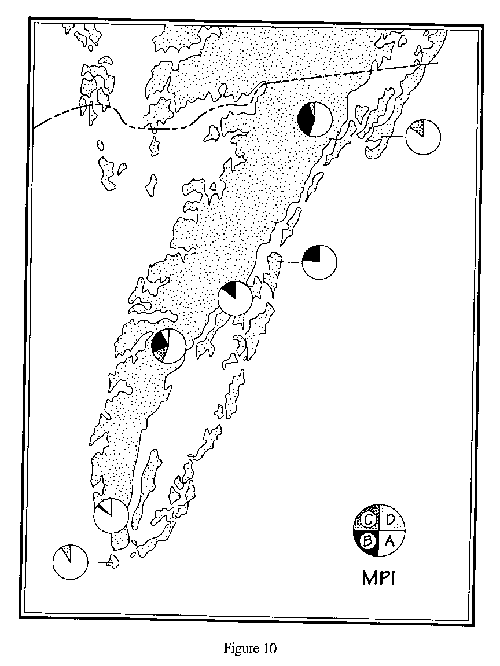 Figure 10. Distribution of allelic frequencies at MPI in seven samples of Peromyscus leucopus. Relative frequencies of alleles are shown as pie diagrams at each locality